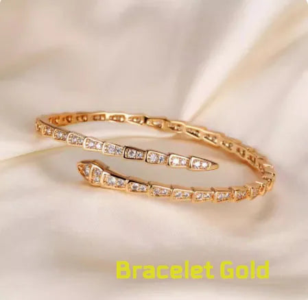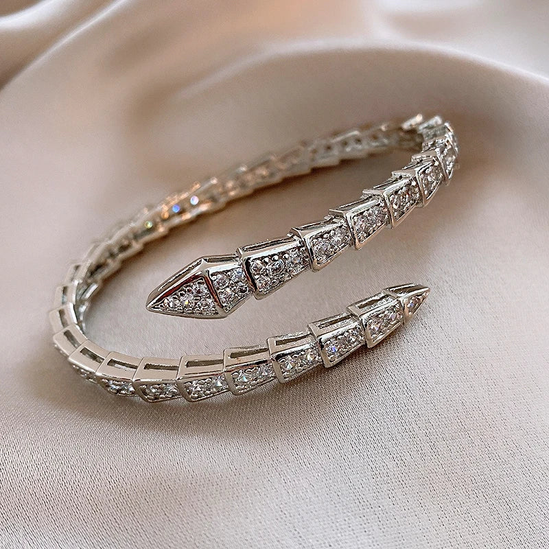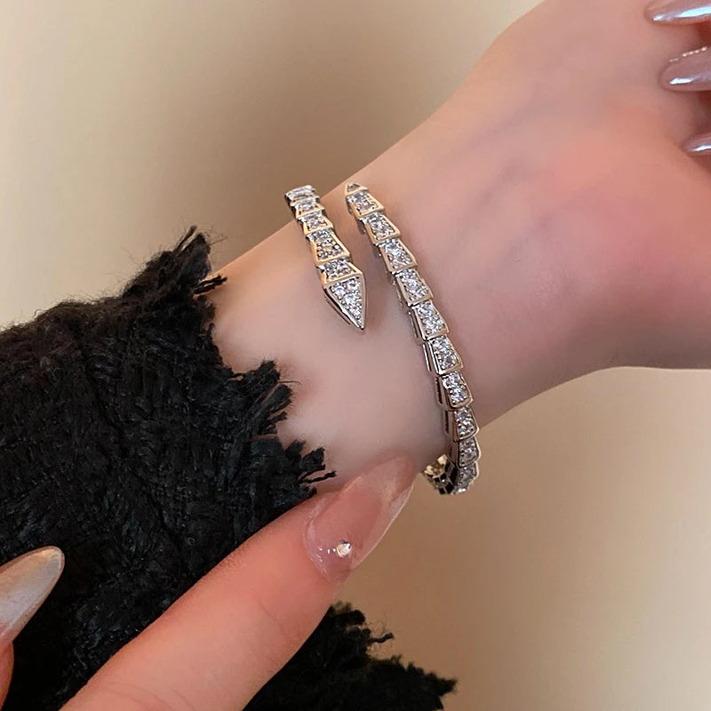 Introducing the Korean New Fashion Snake Bone Open Bracelets and Shiny Zircon Earrings, the ultimate accessories for the modern woman looking to elevate her style. These pieces are perfect for brides, wedding parties, or any glamorous occasion. The snake bone design of the bracelet exudes a trendy yet elegant vibe, while the shiny zircon earrings add a touch of luxury and sparkle, making them an essential addition to your jewelry collection for 2024.